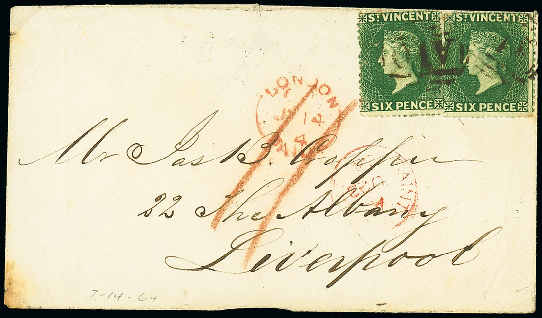 1864 (23 June) double rate envelope to Liverpool, bearing 1862 (Sept.) 6d. deep green (2) cancelled "A10", showing red crayon "11", St Vincent and London Paid (14.7) datestamps in red with arrival c.d.s. on reverse. S.G. 4. Photo