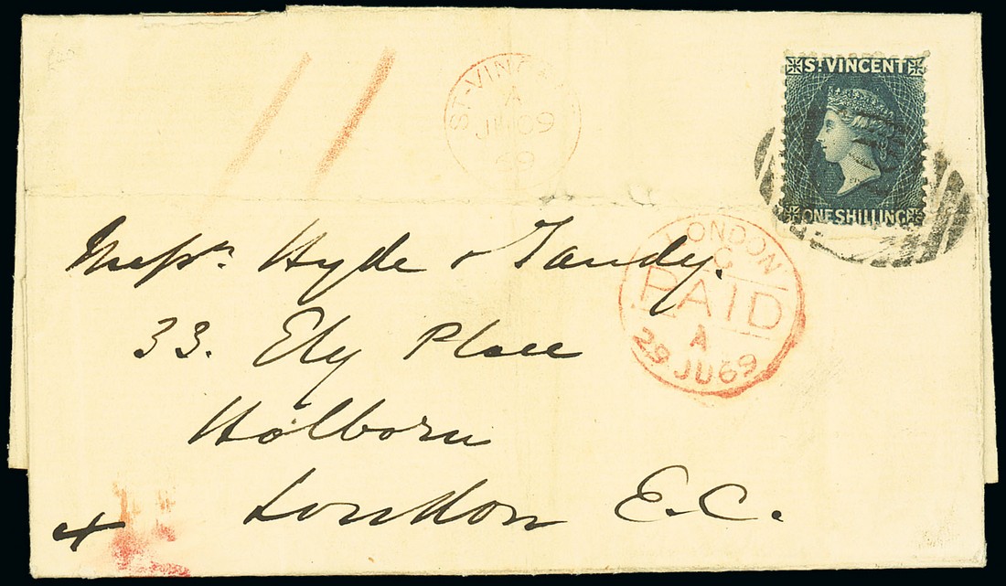 1869 (9 June) entire letter to London, bearing 1869 1/- indigo clearly tied by "A10" obliterator, showing red crayon "11" with St. Vincent c.d.s. and London Paid (29.6) datestamps in red; the entire with heavy horizontal filing crease which crosses the foot of the adhesive and with tear through one back panel. R.P.S. Certificate (1970). S.G. 14. Photo