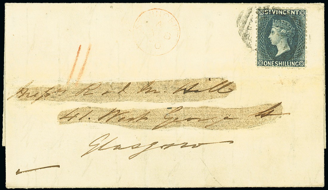 1870 (8 Jan.) entire to Glasgow, bearing 1869 1/- indigo tied by "A10" obliterator, showing red crayon "11", light St. Vincent c.d.s. in red with arrival datestamp on reverse; the address was originally expunged in black ink and this has now been large part removed. R.P.S. Certificate (1970). S.G. 13. Photo