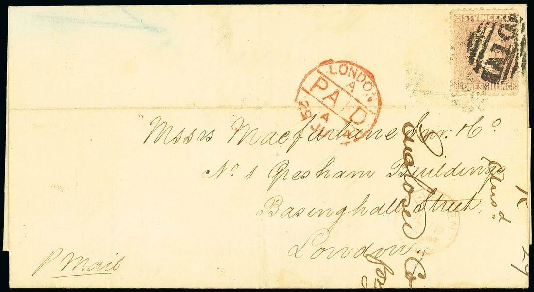 1874 (10 June) entire letter to London, bearing 1873 1/- lilac-rose tied by heavy "A10" obliterator in black, showing light St. Vincent c.d.s. in red and London Paid arrival d.s. (29.6; crossed by heavy horizontal filing crease). A very scarce franking. S.G. 20. Photo