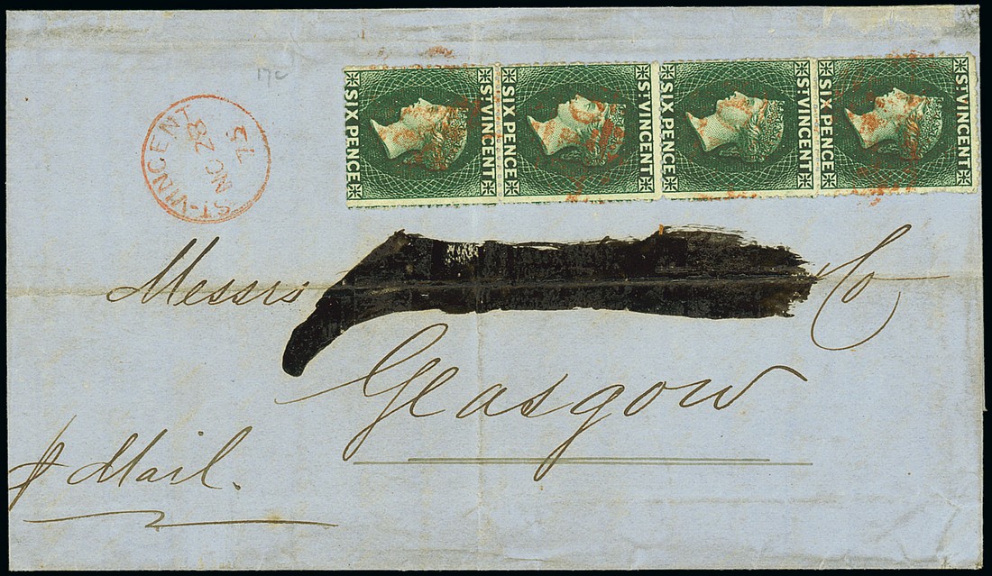 1875 (28 Nov.) double rate entire to Glasgow, bearing 1872-75 6d. deep blue-green vertical strip of four placed sideways and cancelled "A10" in red, showing St. Vincent c.d.s. alongside with arrival d.s. on reverse; the addressee's name heavily expunged with black ink and two filing folds, one of which crosses a 6d.. S.G. 19b. Photo