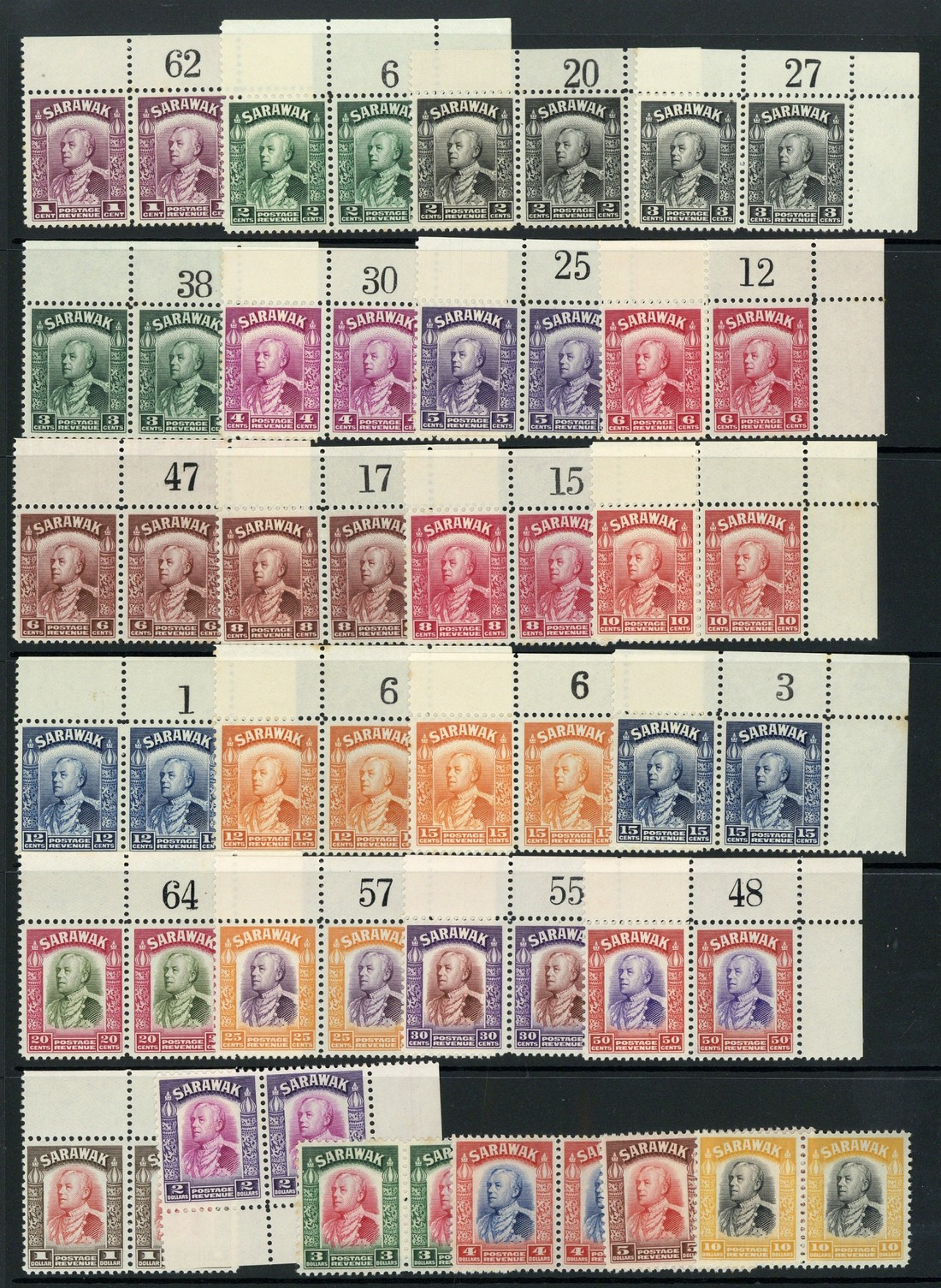 1934-41 1c. to $10 set of twenty-six in pairs, the 1c. to 50c. from the top right corner and all except the 10c. with sheet number, fine unmounted mint. S.G. 106-125, £650