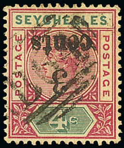 1893 3c. on 4c. carmine and green, variety surcharge inverted, "B64" barred oval cancellation; a little toned. S.G. 15a, £375. Photo