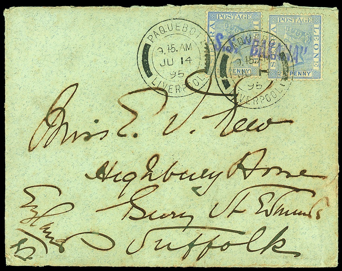 1895 (24 May) envelope, complete with letter headed "Tower Hill", to England, bearing 1884-91 2½d. ultramarine (2) sharing "s.s.'bakana'" h.s. in violet and twice cancelled with "paquebot/liverpool" double-ring d.s. (14.6), Bury St. Edmunds arrival c.d.s. (15.6) on reverse; the contents with reference to celebrations for the Queen's birthday. S.G. 31. Photo