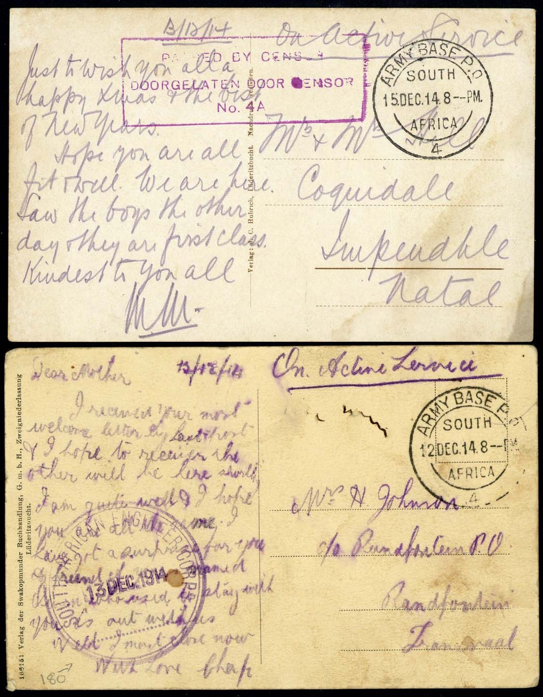 1914 "On Active Service" cards (2), both showing Army base P.O. c.d.s., one with South African Engineering Corps dated cachet, the other with boxed censor cachet