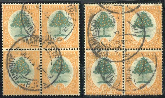 — 6d. blocks of four (2) used at Johannesburg, one with variety missing perf. hole at left between the vertical pair; both a fraction soiled though a scarce pair