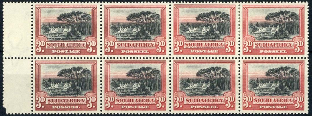 — perf. 14x13½ 3d. marginal block of eight (4x2) with interpanneau margin at left, lightly mounted mint; slight oxidisation at left, otherwise sound