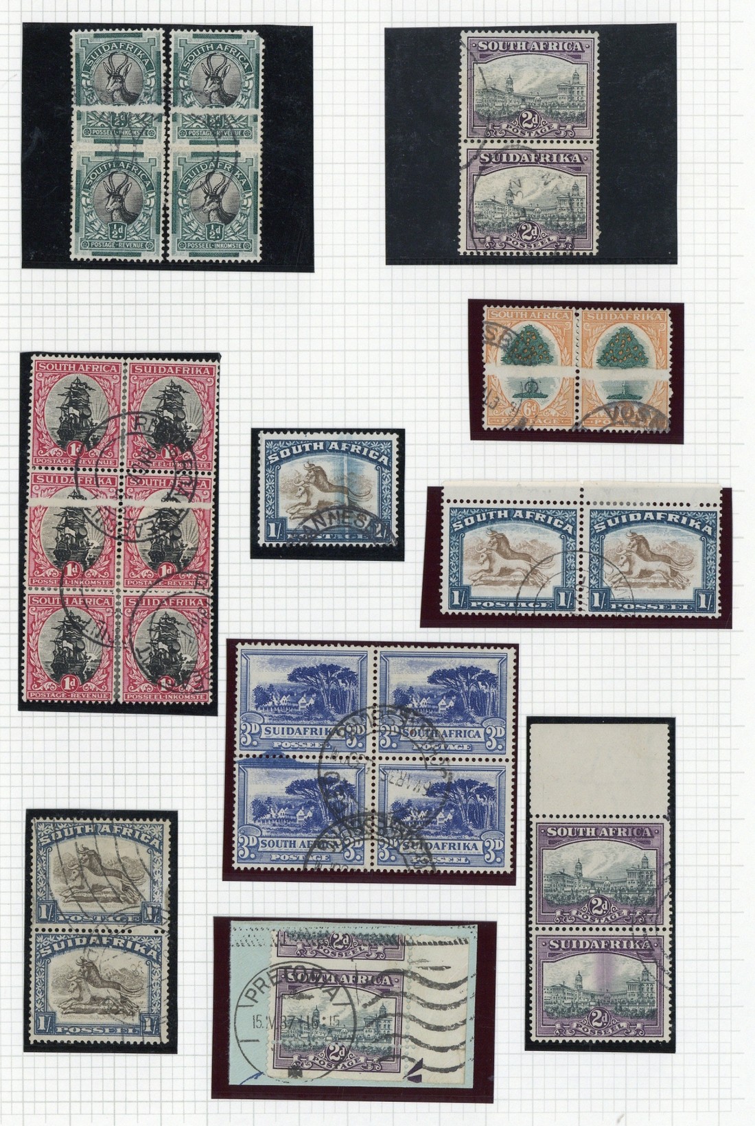 ½d. vertical pairs (2), 1d. block of six, 2d. vertical pair and 6d. pair, all showing paper joins, 2d. vertical pair, 3d. blue block of four and 1/- single all showing inking flaws, 2d. marginal single (on piece) with major horizontal perforation shift, 1/- marginal pair with twisted horn (the normal with inclusion) and 1/- vertical pair showing two perforation holes between missing; used and generally good to fine