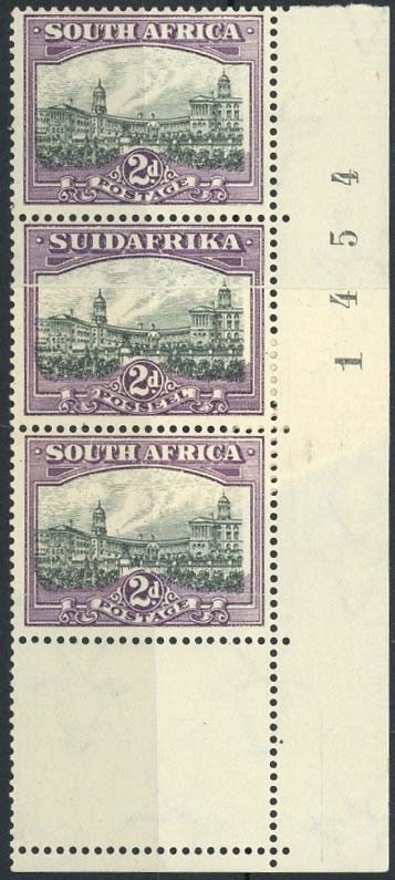 2d. slate-grey and violet lower right corner vertical strip of three with sheet number "1454", the centre stamp with paper join, fine unmounted mint