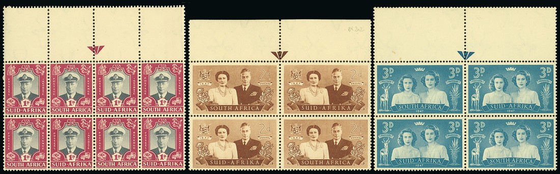1947 Royal Visit range of perforated colour trials on gummed watermarked paper, comprising 1d. block of eight (four se-tenant pairs) in grey and red, grey and carmine and in grey and lake, 2d. blocks of four in pale brown, mauve and in lilac, and 3d. blocks of four in light blue, greenish blue and in bright blue, all marginal from the top of the sheet showing "arrow", superb unmounted mint. SACC R150,000+. Photo