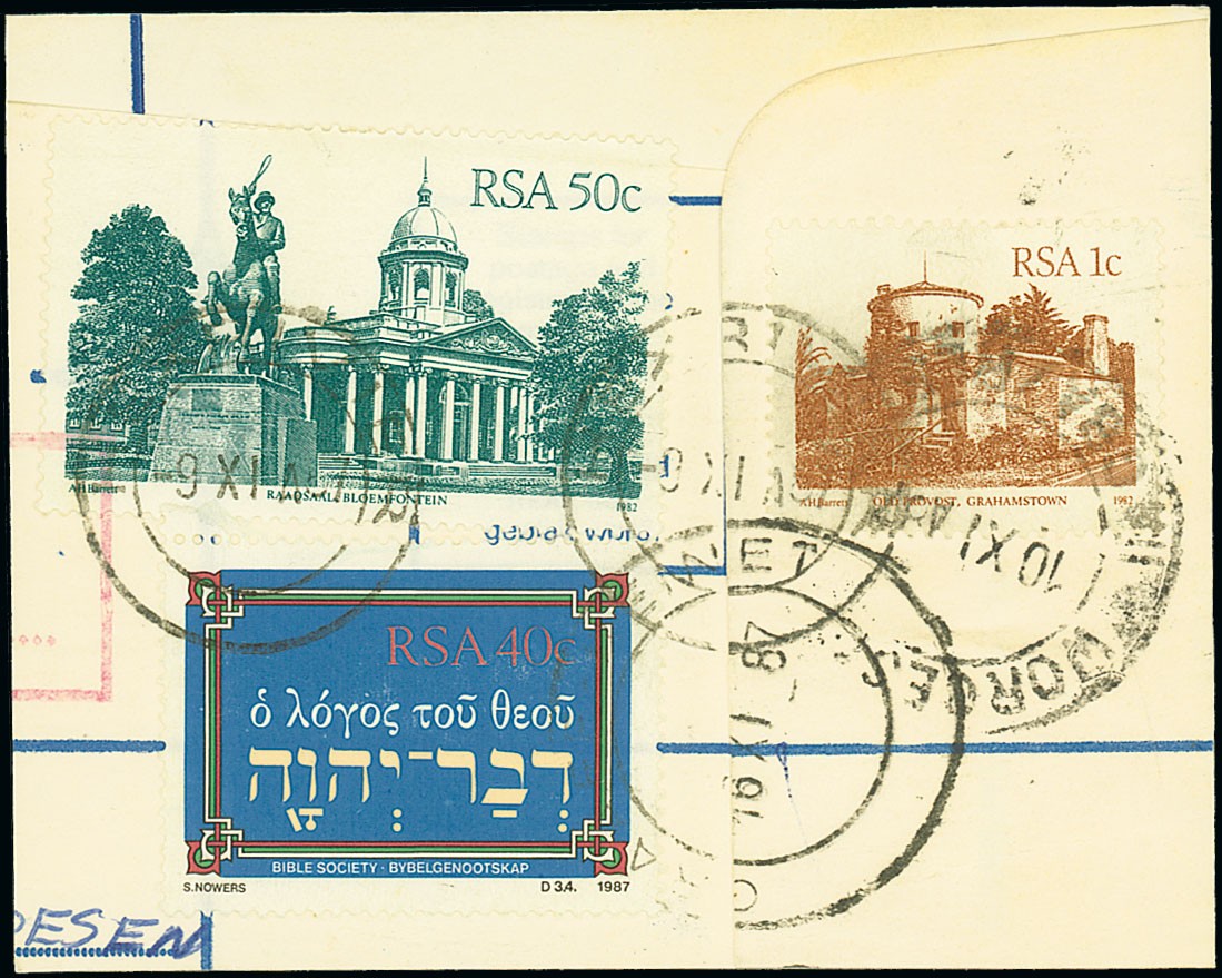 1987 (19 Nov.) Bible Society of South Africa 40c. "The Word of God" together with Buildings 1c. and 50c. cancelled by Hex River c.d.s. 9 November on registered envelope piece, correctly franked at the current registration rate of 91c., also showing Worcester (10.11) and Graaff Reinet (16.11) c.d.s.; a very fine commercially used example of this stamp that was supplied to various post offices before the official date of issue and was subsequently recalled due to religious objections. Cat. £550+. Photo