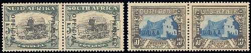 1935-49 overprint reading downwards with "official" at left, 5/- black and blue-green and 10/- blue and sepia horizontal pairs, part to large part original gum. S.G. O28-O29, £620