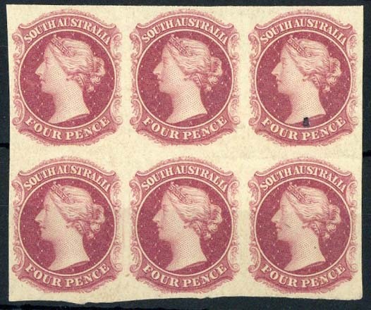 1860 4d. imperforate plate proof in carmine, a block of six (3x2) on thick wove paper, the upper row with light crease and the top right stamp with small black mark at base of Queen's neck, otherwise fine.