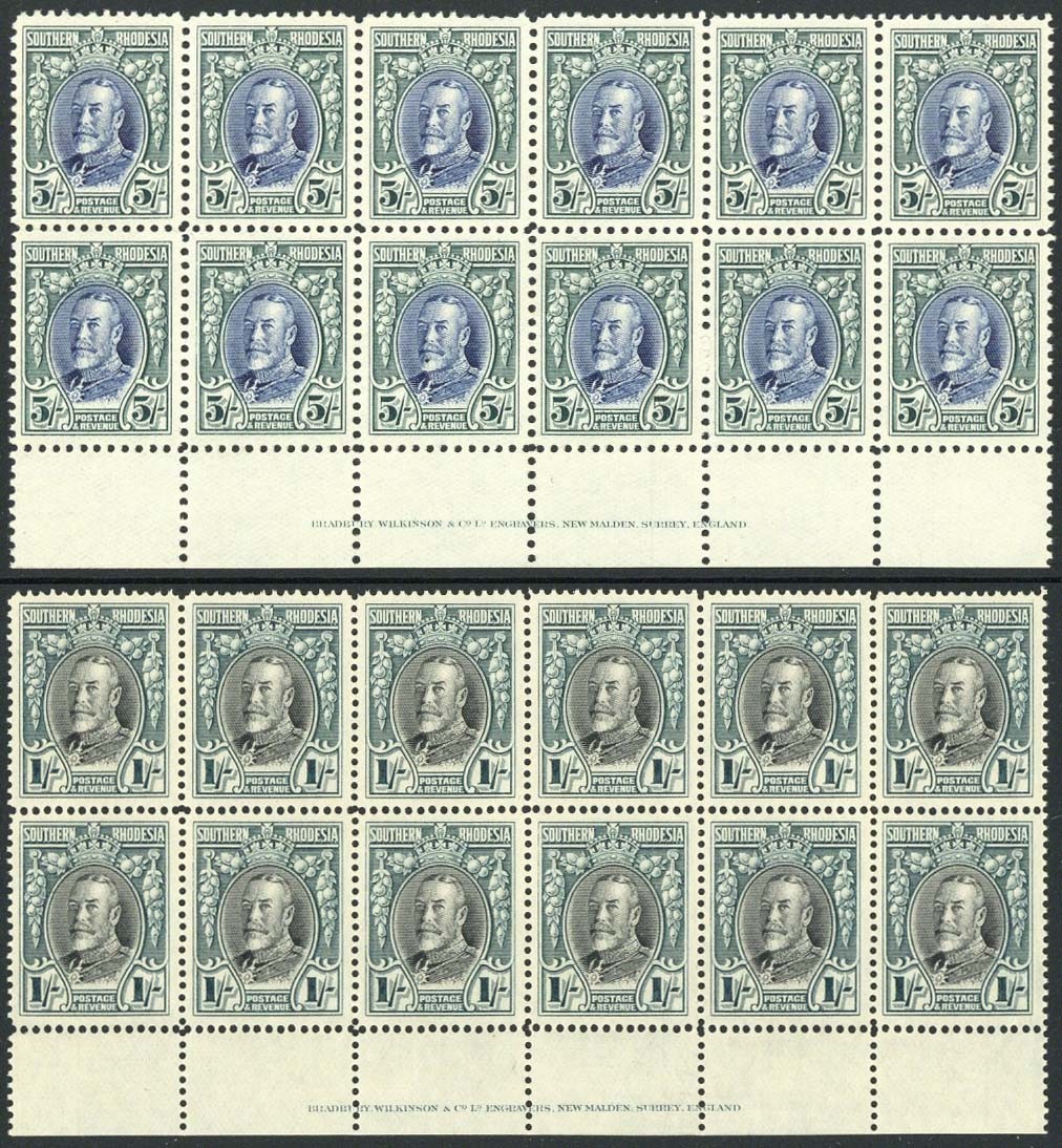 1931-37 Field Marshall issue collection of fifty-six multiples, comprising thirteen blocks of ½d.-1½d. values in blocks of ten or twelve and forty-three block of twelve (6x2) of the 4d. to 5/- values, the latter all from the foot of the sheet with imprint, all with 5 digit requisition number and date of printing/despatch written on the individual cards in which they are presented; the range comprises all perf. varieties except the 1½d. perf. 12 which was only available in booklets. All without gum as from the printer's archive. A rare and important group. S.G. 15-16c, 19-27