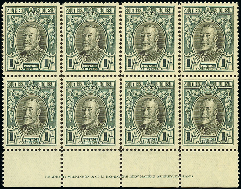 — 1/- black and greenish blue imprint block of eight (4x2), fine unmounted mint. A fine and very rare block of the rarest stamp from this issue. S.G. 23b, £1,800+. Photo