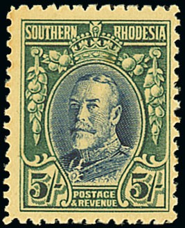 — 5/- blue and blue-green, variety printed on the gummed side, unmounted mint, small stain in the lower right portion of the Crown and gum fractionally toned; a fine example of this rare variety. P. Holcombe certificate (and the stamp signed in pencil). S.G. 27a, £8,000. Photo1200.