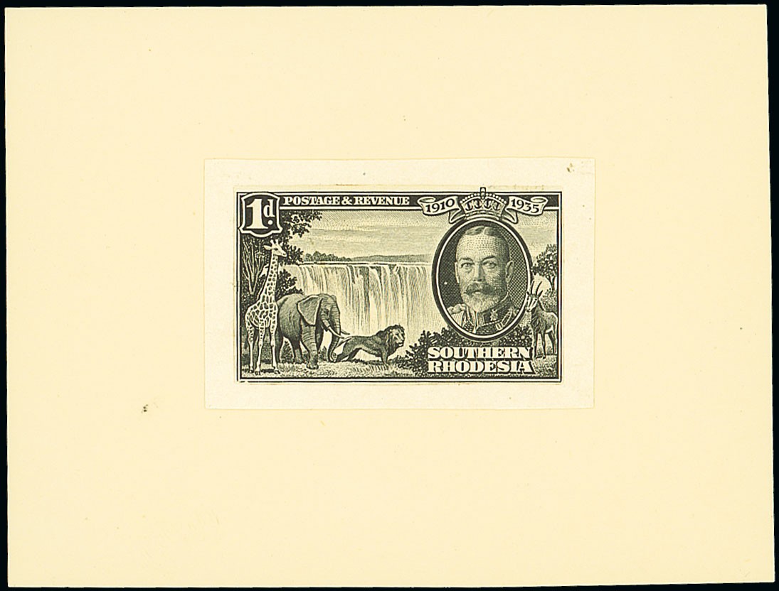 1935 Silver Jubilee, 1d. stamp-size die proof printed in two operations at showing guide cross at centre of left-hand frameline, in black affixed to piece of glazed paper (46x30mm.) and then to another piece (91x69mm.); a couple of small imperfections, otherwise fine. Very rare. B.P.A. Certificate (2011)