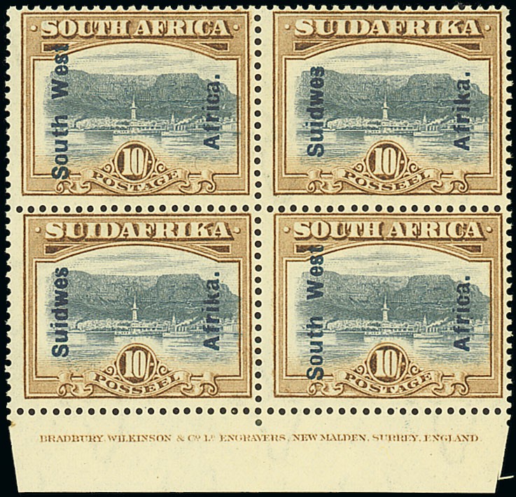 1927 (Apr.) Pictorial 2d. to 10/- in imprint blocks of four, the 3d. lightly gum toned otherwise fine mint, the 2/6d. to 10/- mounted in the selvedge only. An exceedingly rare set of blocks. S.G. 49-54. Photo