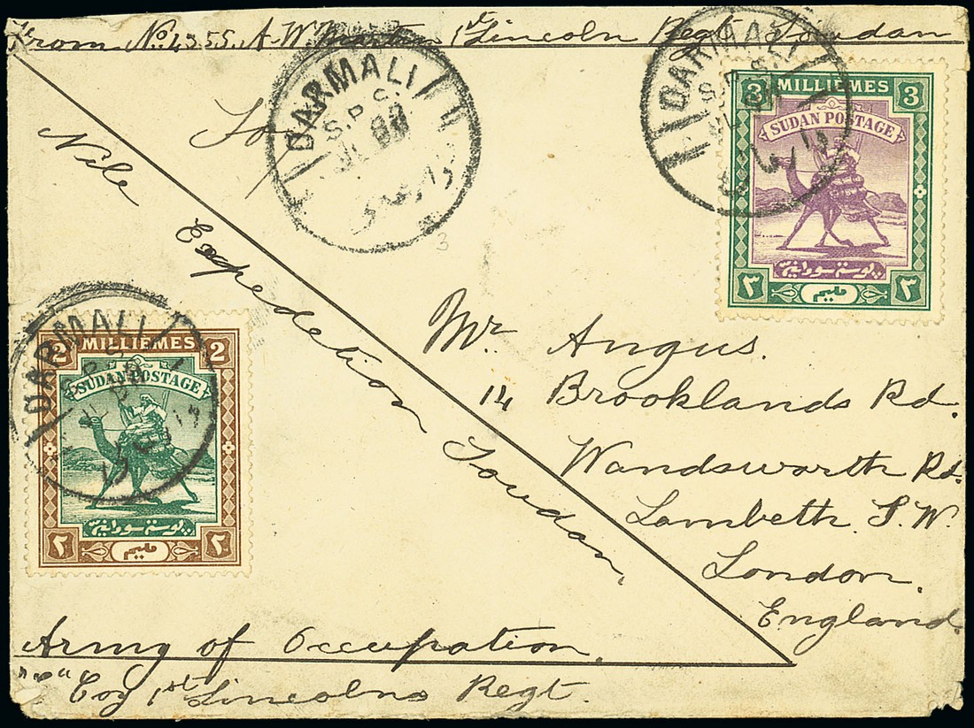 1898 (31 July) envelope to London, headed "From 4355 A.W. Martin 1st Lincoln Regiment Soudan", marked "Nile Expedition Soudan" and "Army of Occupation", bearing 1898 Camel 2m. and 3m., both tied by bi-lingual "darmali/s.p.s." c.d.s. and showing, on reverse, Wadi Halfa (5.8) and Alexandria (12.8) datestamps; small imperfections though unusual in not being countersigned by the Commanding Officer which, from early in 1897, did not appear to be compulsory to achieve the concession. Rare with very few stamped soldier's covers recorded from this expedition. Photo