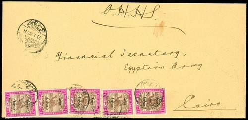1907 (23 Jan.) OHMS envelope (251x108mm.) to the Financial Secretary of the Egyptian Army at Cairo, bearing Army Service 1906-11 later printing 1m. brown and carmine (5) tied by Khartoum North c.d.s.; envelope flap missing and fractionally reduced at top though rare usage of these stamps on cover. Ceremuga Certificate (2010). S.G. A6. Photo