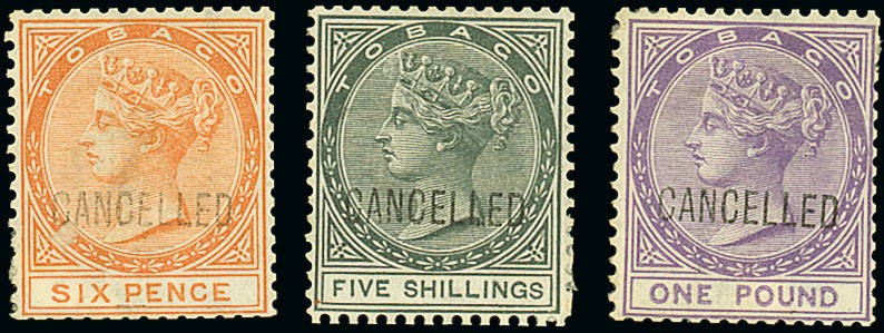1879 CC 6d. orange with watermark inverted, 5/- slate and £1 mauve, each handstamped "cancelled" (Type D7), all with small part or part original gum (light creases), the 6d. and £1 with perfs trimmed on one side, otherwise fine. S.G. 3, 5, 6. Photo