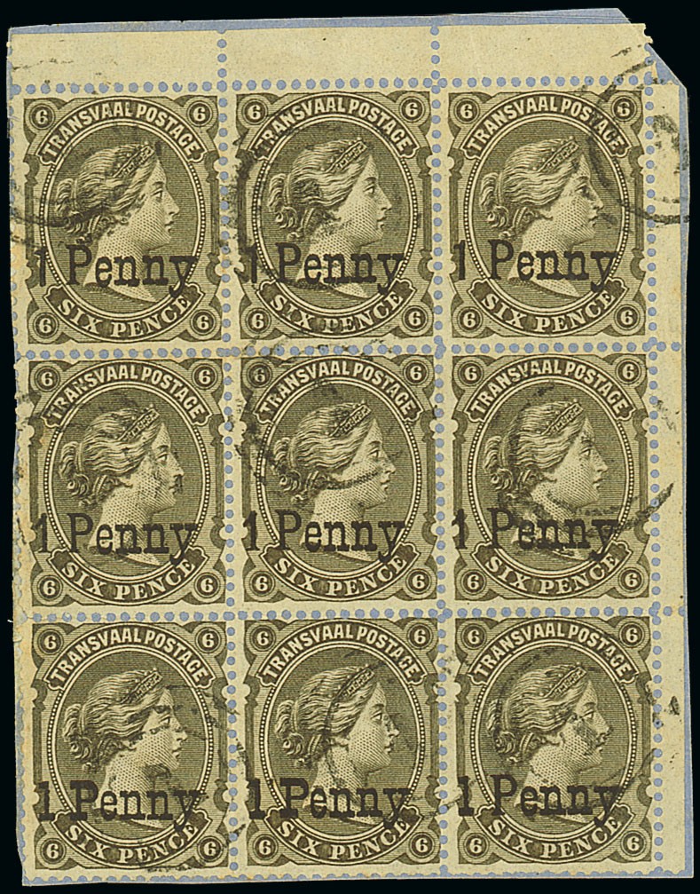 1879 (Apr.) "1 Penny" in black on 6d. upper right corner block of nine [8-30], comprising S.G. Types 10 (3), 11 (3), 12 and 13 (2), all cancelled "11" and affixed to blue paper fragment. A fine and rare multiple. R.P.S. Certificate (1974). S.G. 140-143, £1790+. Photo