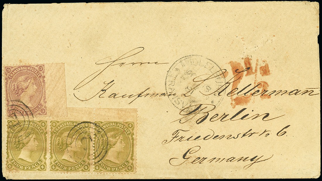 1881 (18 Oct.) envelope from Middleburg to Germany, bearing 1878 3d. with margin at right and 4d. strip of three with margin at top, all cancelled by "12" three-ring obliterator, showing despatch c.d.s., "2½d" accountancy h.s. in red and, on reverse, Potchefstroom, Cape Town, London and Berlin datestamps; some light overall soiling. Photo