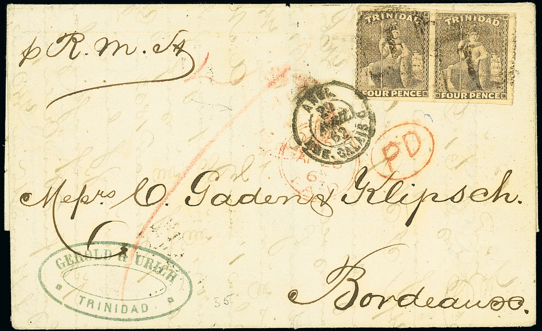 1862 (Apr.) entire to Bordeaux, bearing 1861 rough perf 4d. brownish lilac pair with perforations on the vertical sides, lightly cancelled "1" and showing red crayon "7", Crowned circle "paid/at/trinidad" overstruck by London Paid transit d.s. and Calais entry c.d.s., oval-framed "pd" and, on reverse, despatch and arrival datestamps. S.G. 54. Photo