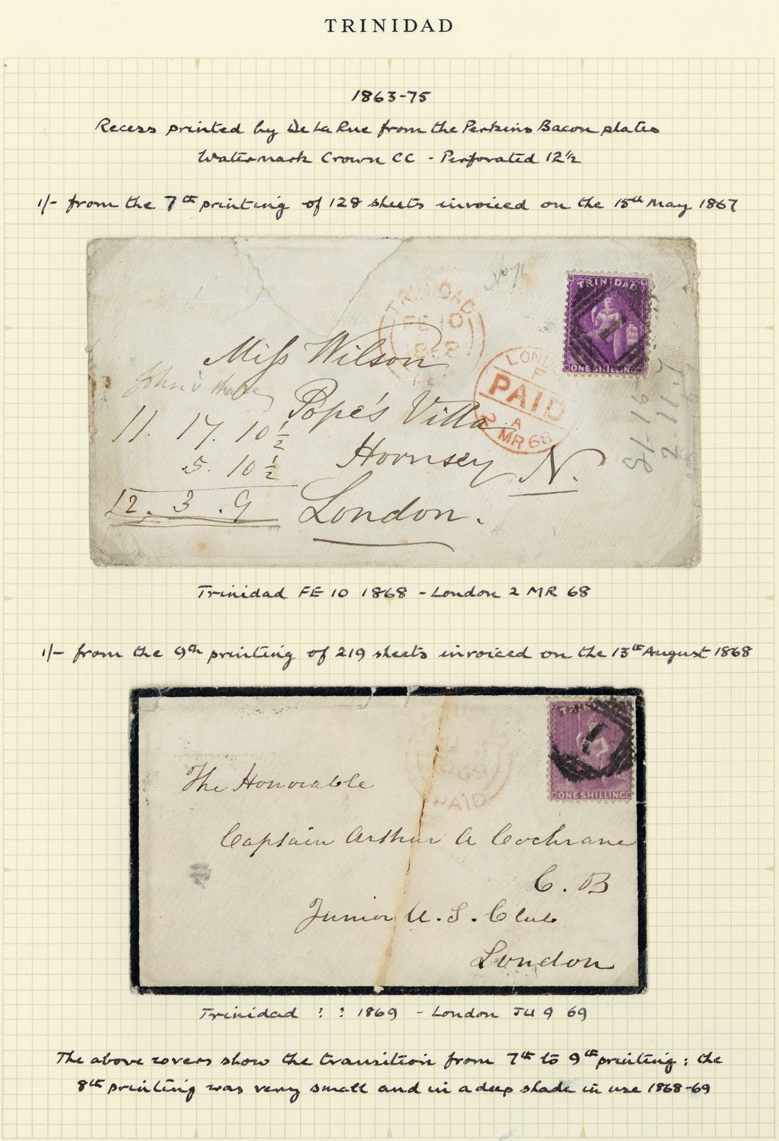 1863-71 entire letter and envelopes (6) each bearing 1863-72 1/- (three different printings) tied by "1" obliterators (4), "1" c.d.s. and double-arc d.s. (2), all but the earliest with red Trinidad Paid c.d.s. alongside; condition a little mixed