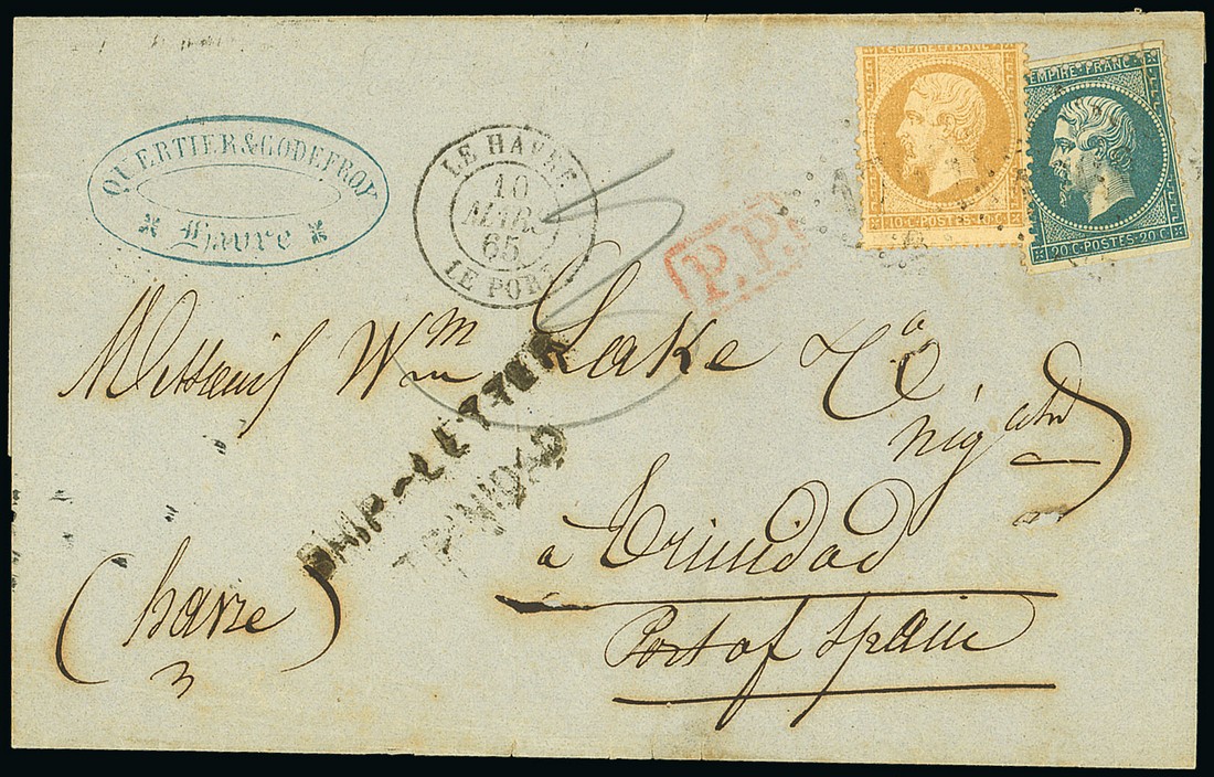 1865 (10 Mar.) entire from France to Port of Spain, bearing 1862 10c. and 20c. lightly cancelled "1769" and showing despatch c.d.s., boxed "p.p." in red and a fine strike of the exceedingly rare "ship-letter/trinidad" handstamp applied on arrival, one of only two examples recorded. Photo