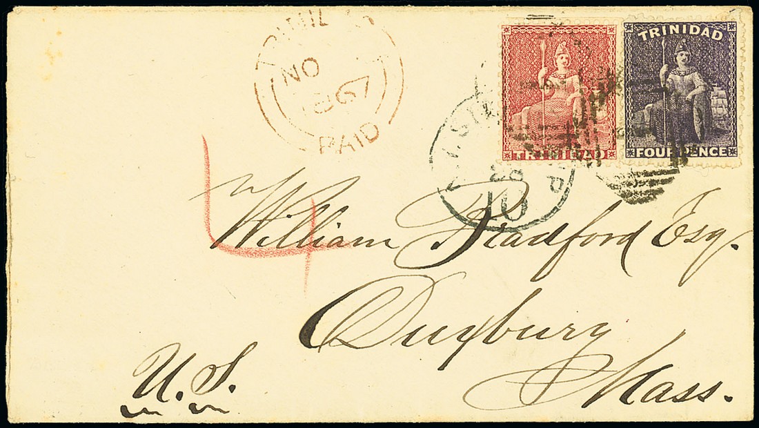 1867 (Nov.) envelope to Massachusetts, bearing 1863-80 1d. and 4d. tied by "1" obliterator, showing red crayon "4", "trinidad/paid" double-arc d.s. alongside, "n.y. steamship/10" c.d.s. additionally tying the 1d. and, on reverse, St. Thomas transit d.s. Neat and attractive. Photo
