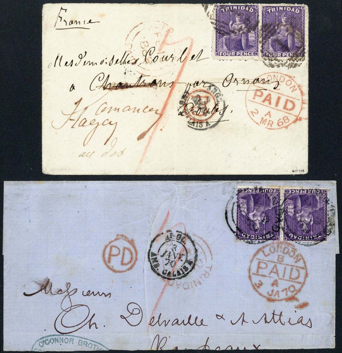 1868 (Feb.) envelope (central vertical fold) to France, bearing 1863-72 4d. bright violet pair cancelled by "1" obliterator, showing red crayon "7", circular-framed "pd" overstruck by Calais entry d.s., London Paid transit c.d.s. (2.3) with, on reverse, various French transit c.d.s.; also 1869 (Dec.) large piece to France bearing 4d. bright violet pair cancelled with double-arc d.s. S.G. 70