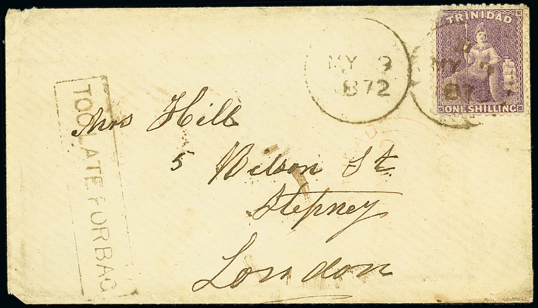 1872 (May) envelope from Cedros to London, bearing 1863-80 perf. 12½ 1/- lilac-rose (corner fault at upper left) tied by light c.d.s. with a further strike alongside and with a good strike of the rare "too late for bag" framed handstamp used on the Cedros steamer. Rare. Photo