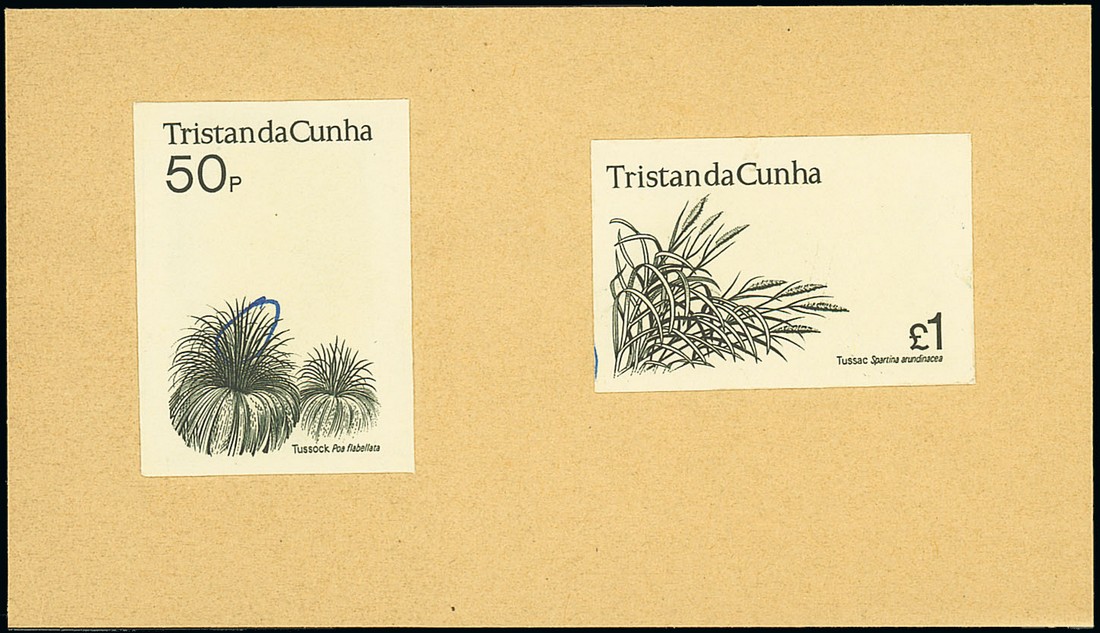 1972 Flora definitive issue 50p. Tussock and £1 Tussac, die proofs of the vignette and value tablet, both mounted on card (121mm. x 69mm.). Fine and very rare. Photo