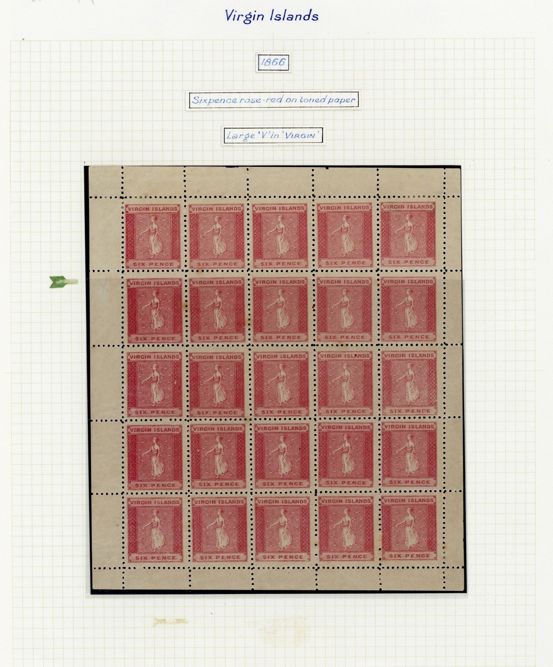 6d. rose-red complete sheet of twenty-five, [6] showing variety large "v" in "virgin", large part original gum. A fine, rare and spectacular showpiece. S.G. 7/7a, £1715