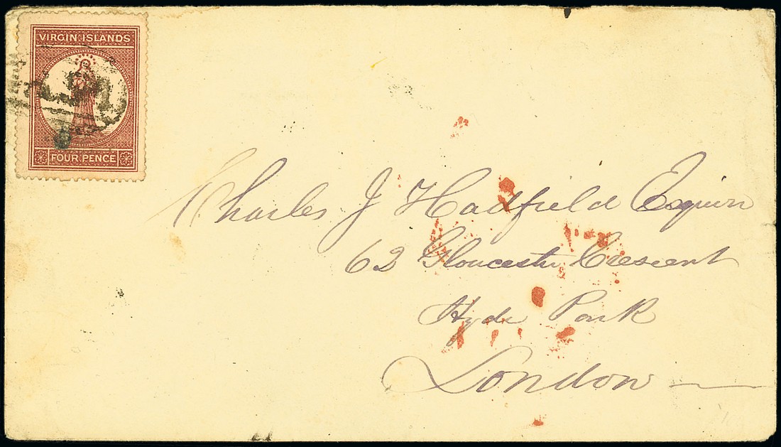 4d. lake-red tied by smudged "A91" obliterator on 1881 (12 Aug.) envelope ex the "Cadfield" correspondence from Tortola to London, some red ink marks on face and showing, on reverse, despatch and arrival (26.8) datestamps; the envelope with pressed central vertical crease. S.G. 15. Photo
