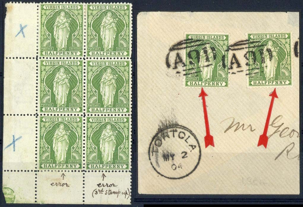 ½d. yellow-green mint lower left corner block of six (2x3) showing varieties "halfpfnny" and "f" without cross bar, and used singles on piece with the same varieties, fine. S.G. 43a, 43b; £410