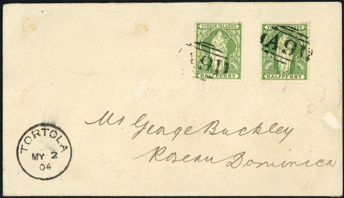 ½d. yellow-green used (2) showing varieties "halfpfnny" and "f" without cross bar, both cancelled "A91" on 1904 (2 May) envelope from Tortola to Dominica. S.G. 43a, 43b; £240