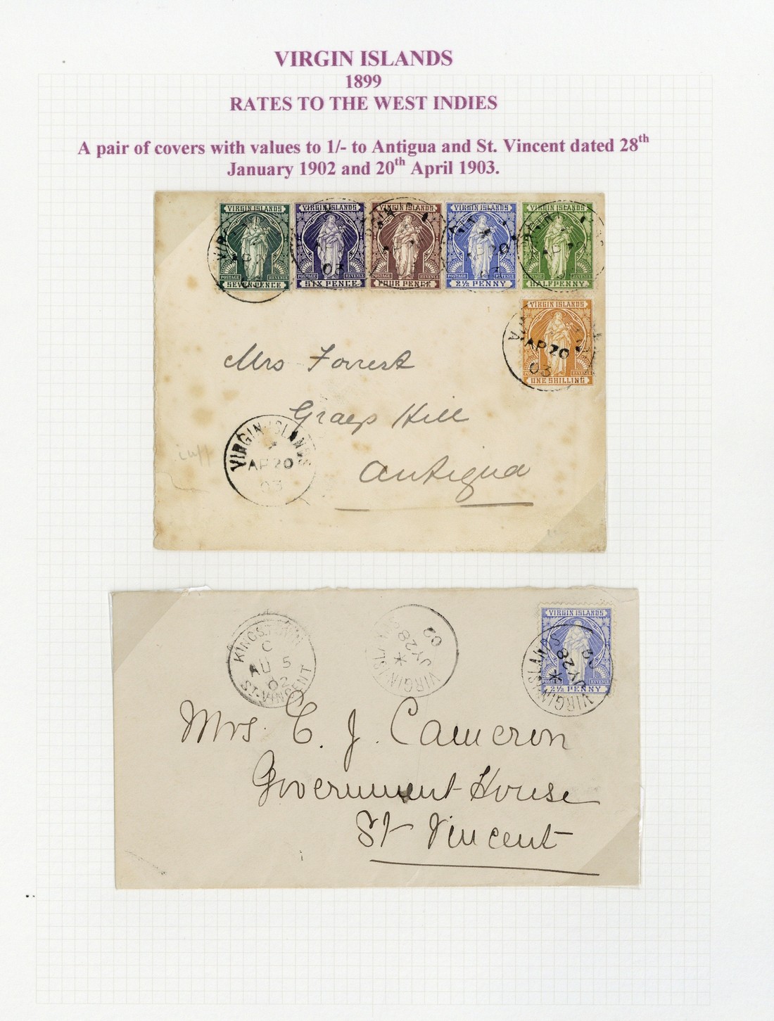 1899 (22 May) envelope registered to Barbados bearing ½d. (8) lightly cancelled "A91", 1899 (July) envelope registered to Nova Scotia bearing 4d. tied by "A91" obliterator, 1902 (May) envelope registered to USA and redirected internally bearing ½d. and 4d. tied by Tortola c.d.s., 1902 (July) envelope to St. Vincent bearing 2½d. tied by c.d.s., and 1903 (Apr.) envelope (light stains) to Antigua bearing ½d. and 2½d. to 1/-, all tied by c.d.s.