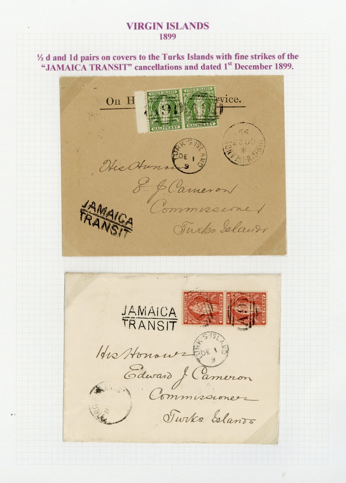 1899 (Oct.) and (Nov.) envelopes to Turks Islands bearing ½d. and 1d. pairs respectively, both cancelled "A91" and showing despatch c.d.s., "jamaica/transit" h.s. and arrival datestamp. An attractive pair