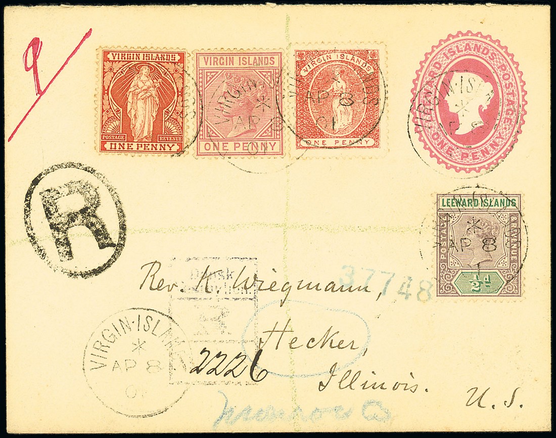 1901 (8 Apr.) 1d. stationery envelope registered to USA uprated with 1890 ½d. and three different Virgin Islands 1d., all cancelled with Virgin Islands c.d.s., showing "R" in oval, St. Thomas registration h.s. and, on reverse, St. Thomas and arrival datestamps. Photo