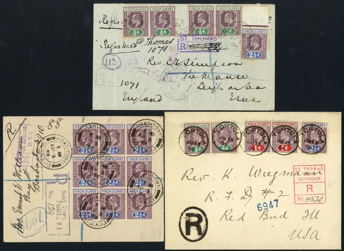 1904 (15 June) envelope registered from Tortola to USA bearing 1904 ½d. and 1d. pairs and 2½d., all tied by c.d.s. and showing fine St. Thomas registration handstamp; 1908 (3 Apr.) envelope registered from Road Town to Barbados bearing 1904 2½d. block of nine cancelled by double-ring d.s., and showing despatch and St. Thomas registration handstamps; and 1914 (Sept.) envelope registered from Road Town to England bearing 1904 ½d. pairs (2) and 2½d. (some minor foxing around adhesives) tied by double-ring d.s. and showing despatch and St. Thomas registration handstamps