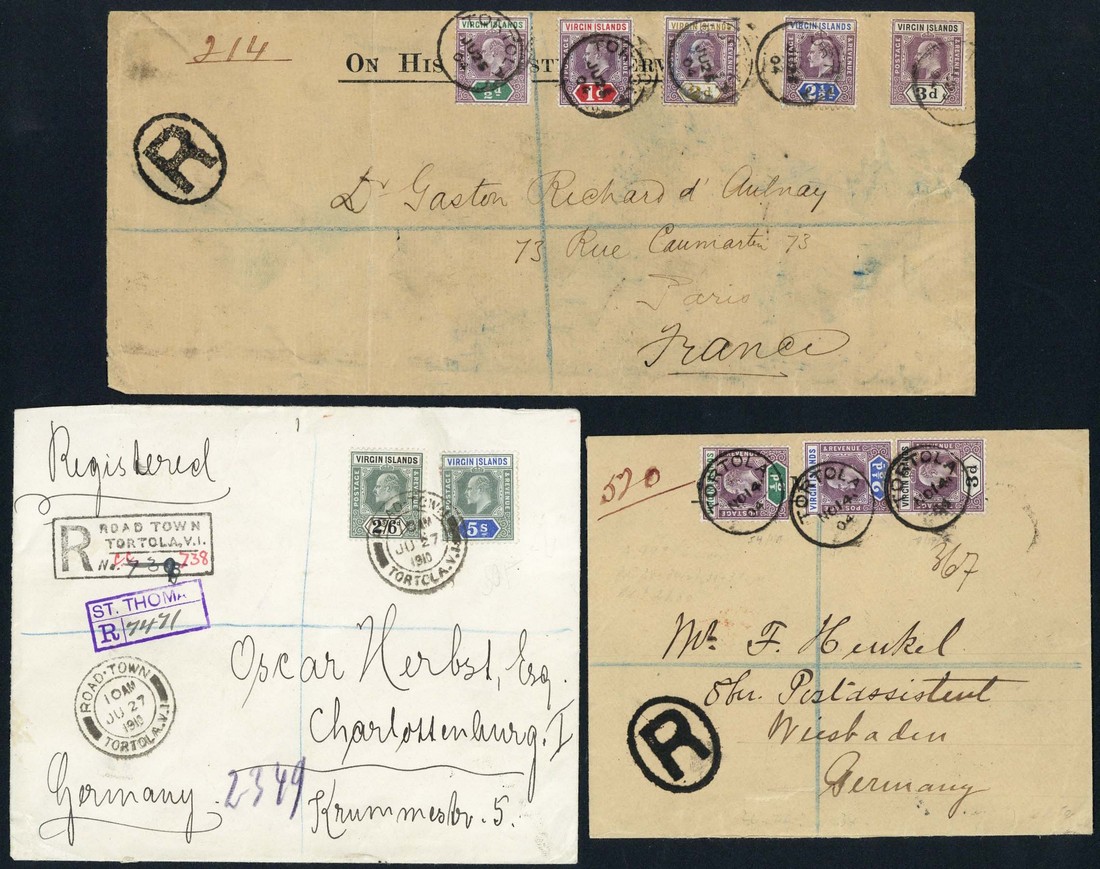 1904 (25 June) long OHMS envelope (small faults) registered from Tortola to Paris bearing 1904 ½d. to 3d., each tied by c.d.s.; 1904 (14 Nov.) envelope registered from Tortola to Germany bearing 1904 ½d., 2½d. and 3d., each tied by c.d.s.; and 1901 (27 June) envelope registered from Road Town to Germany bearing 1904 2/6d. and 5/- tied by double-ring d.s.