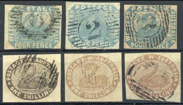 4d. (3, shades) and 1/- (3, shades) used examples, all with four margins (one 4d. close on all sides), some imperfections, but generally a good lot. Cat. £2350