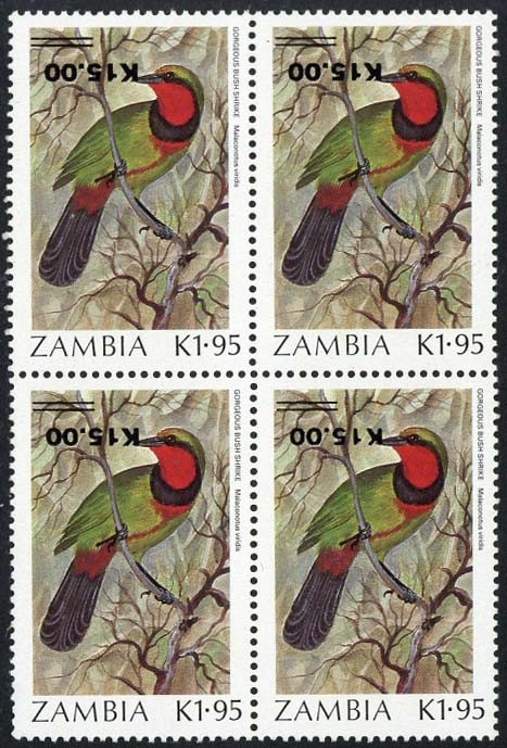 — 15k. on 1k.95 block of four, variety surcharge inverted, fine unmounted mint. S.G. 593var.