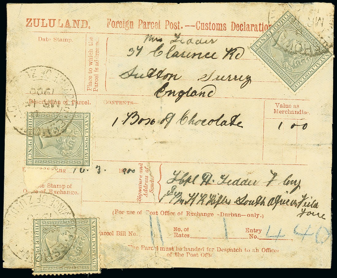 1900 (16 Mar.) Foreign Parcel Post Customs Declaration Form for "1 Box of Chocolate" from a member of the South Africa Field Force at Eshowe to England, bearing Natal 3d. grey (3) all cancelled by double-ring datestamp; a remarkable and exceptionally rare item. Photo