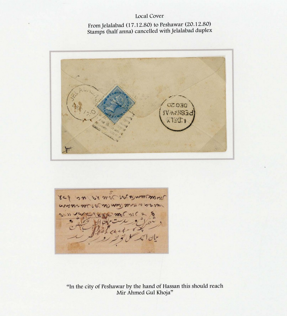 1880 (17 Dec.), local envelope from Jelalabad to Peshawar, franked on reverse India ½a. blue with Jelalabad duplex cancellation; fine