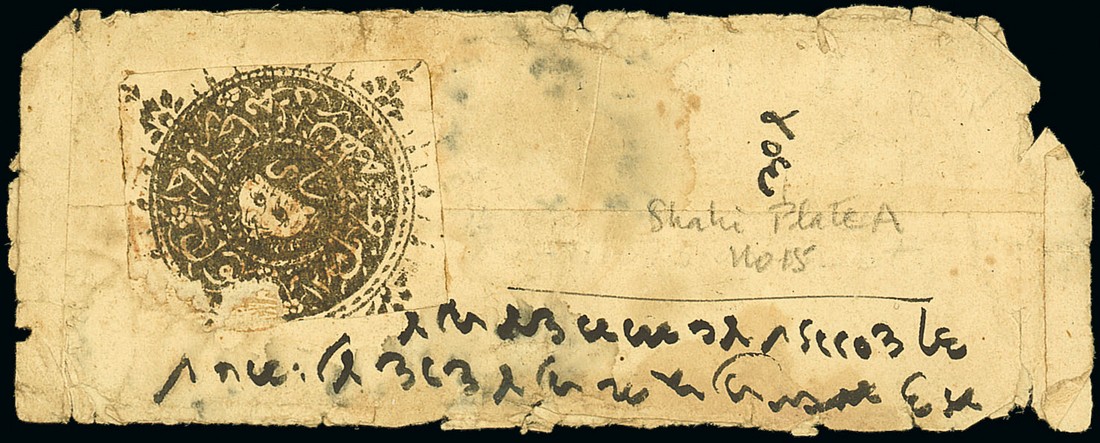 Plate A Shahi black [15], on native cover with red cancellation and usual "cut" corner. S.G. 1. Photo