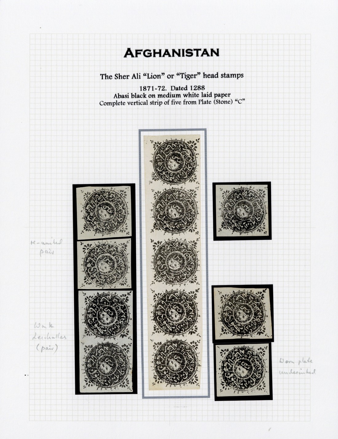 Plate C Shahi, Sanar and Abasi black, collection of thirty-seven, including complete reconstruction of fifteen types (ex Dietrich), Abasi unused pair and strip of five, Sanar on cover with "bite", usual mixed condition. S.G. 3, 6, 8