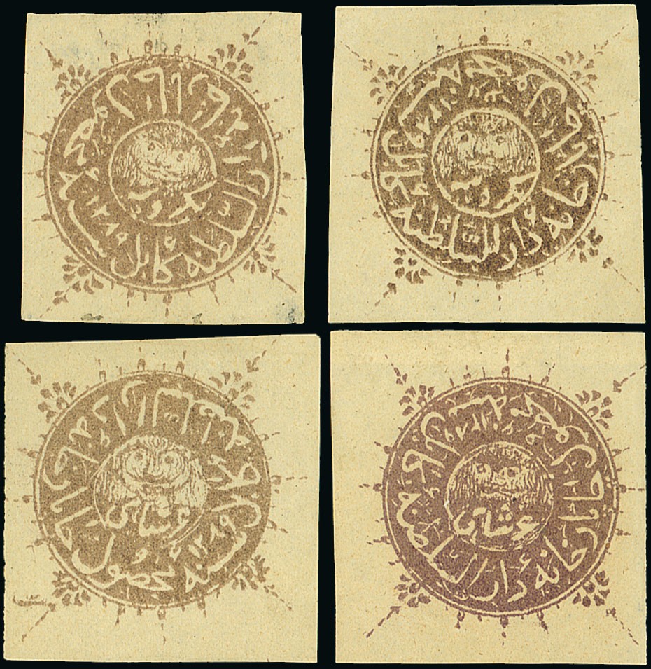 6 shahi [3-4] and 1 rupee [1-2] reddish purple, reconstructed sheet of four, unused, all cut square and with large margins all round, some faults, as are usually associated with this issue, but fine to very fine for these. [2] with R.P.S. Certificate (1998). 10-11. Photo